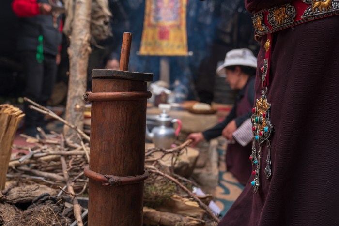 Almost every Tibetan family owns a wooden churning tube for making the butter tea. To make a delicious and smooth bowl of butter tea, first we need to boil the brick tea and filter out the leaves. Then pour the brick tea liqueur in the tube, add yak butter, cheese and salt, churn constantly so to mix the ingredients thoroughly. Now it’s ready!
